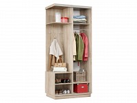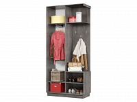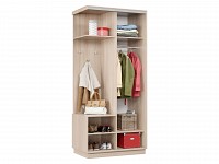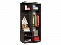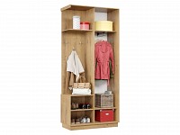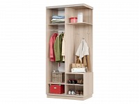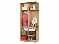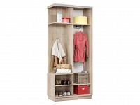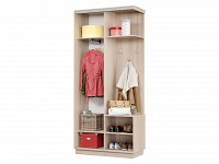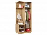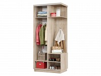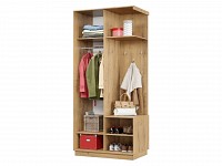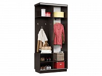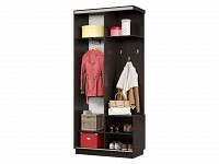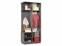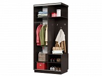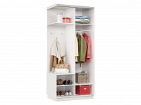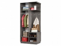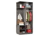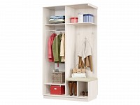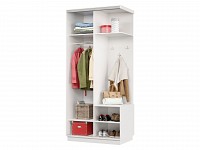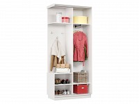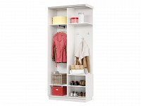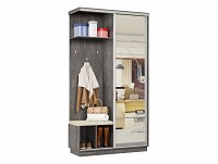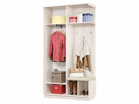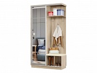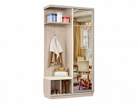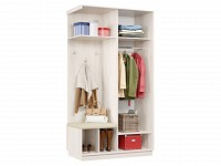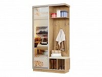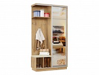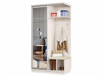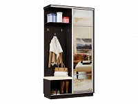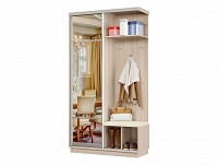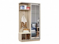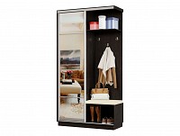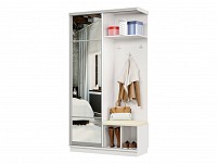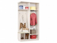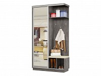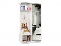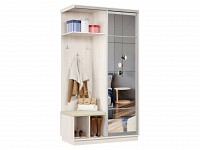 Система хранения поделена на две равные по размерам части: отделение со штангой и нишу с полками и крючками для повседневной одежды. Дверь перемещается по однополосному треку вправо и влево, поочередно открывая и закрывая каждую из секций, что особенно важно для узкого коридора. Зеркальный фасад позволит в деталях оценить подобранный образ и визуально расширит пространство помещения. Мягкое сиденье даст возможность с комфортом снимать и надевать обувь.