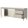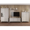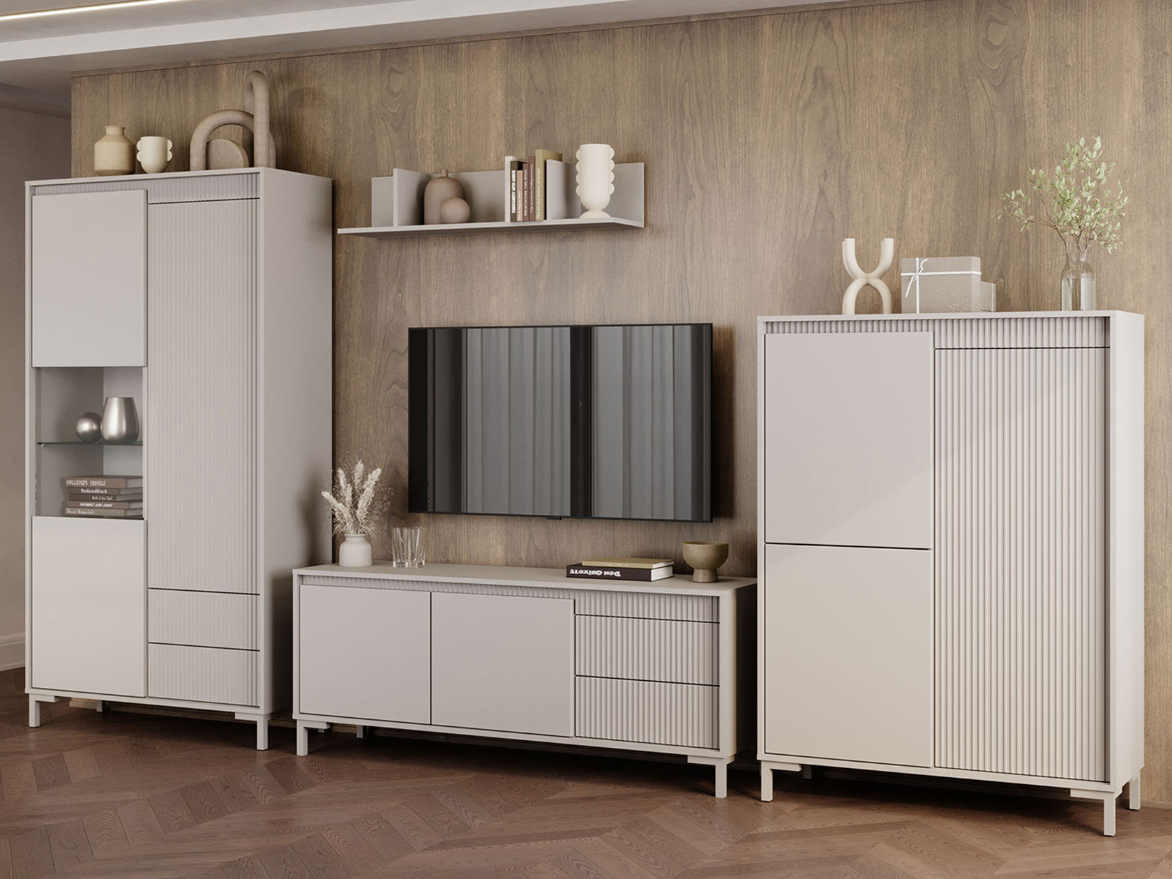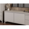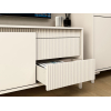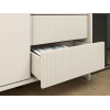 За распашными дверцами и в выдвижных ящиках можно разместить разные категории вещей: одежду, постельное белье, аксессуары. Вертикальная фрезеровка придает мебели особый шарм, а высокие ножки облегчают уборку. Фасады открываются легким нажатием.