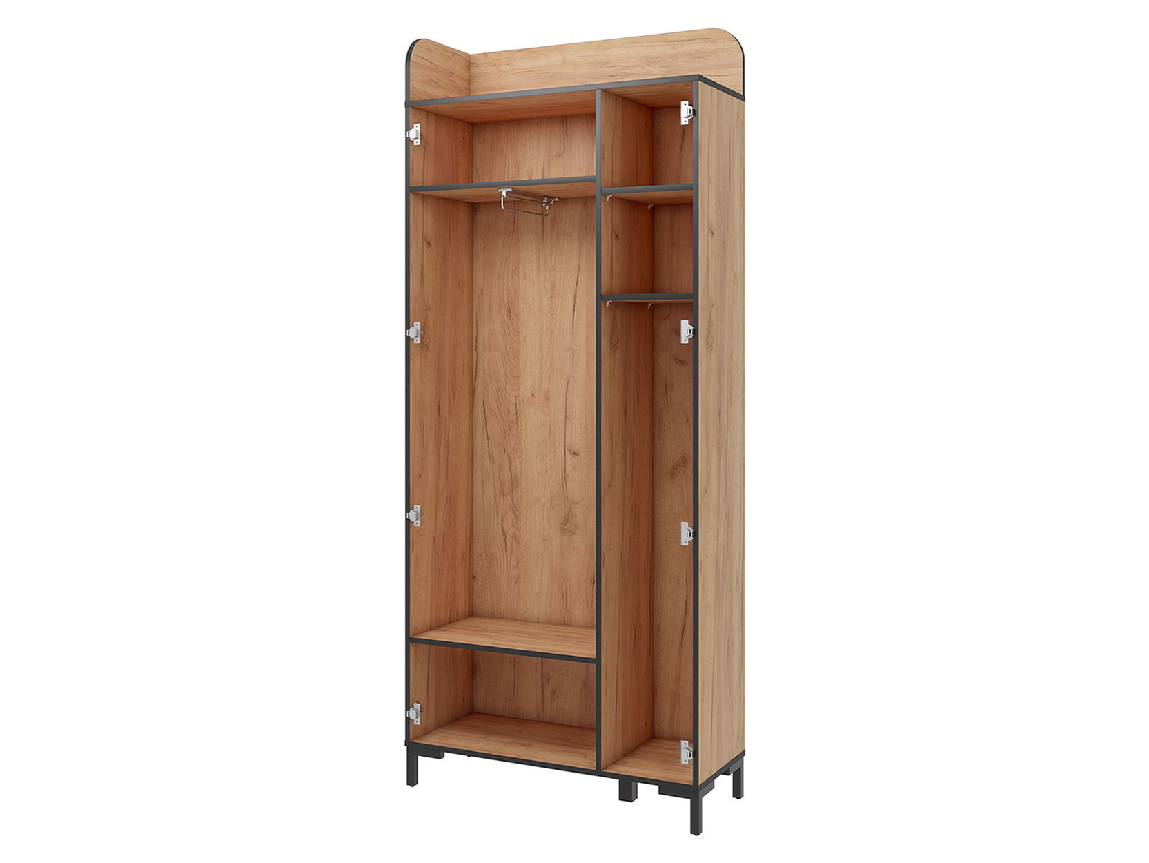 Компактная и визуально легкая конструкция выполнена в натуральных природных оттенках с минималистичной фурнитурой. За распашными дверцами можно спрятать обувь и аксессуары, а на крючках — аккуратно развесить повседневную одежду. Небольшие ножки добавляют мебели устойчивости и позволяют без труда поддерживать чистоту в коридоре.